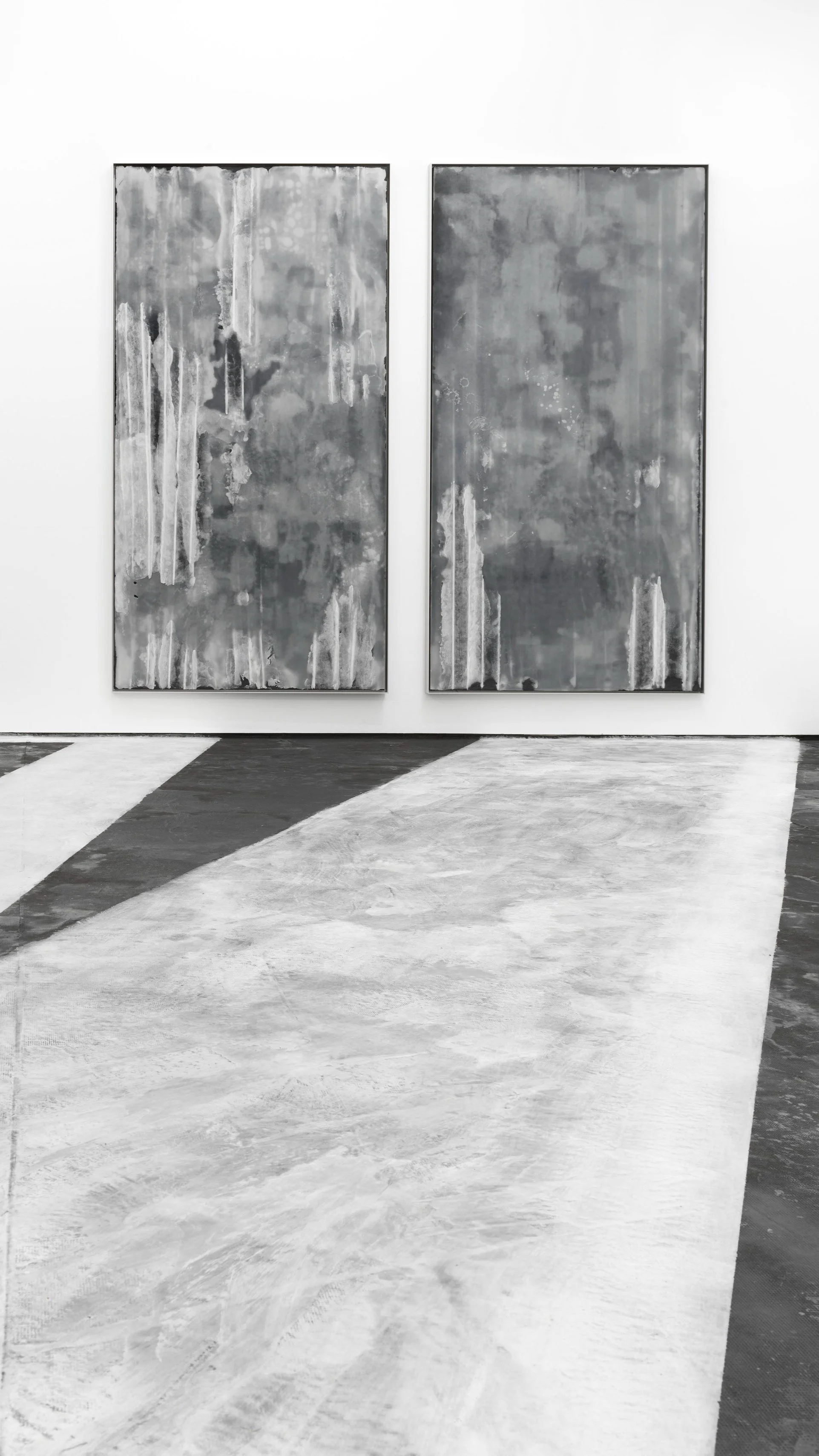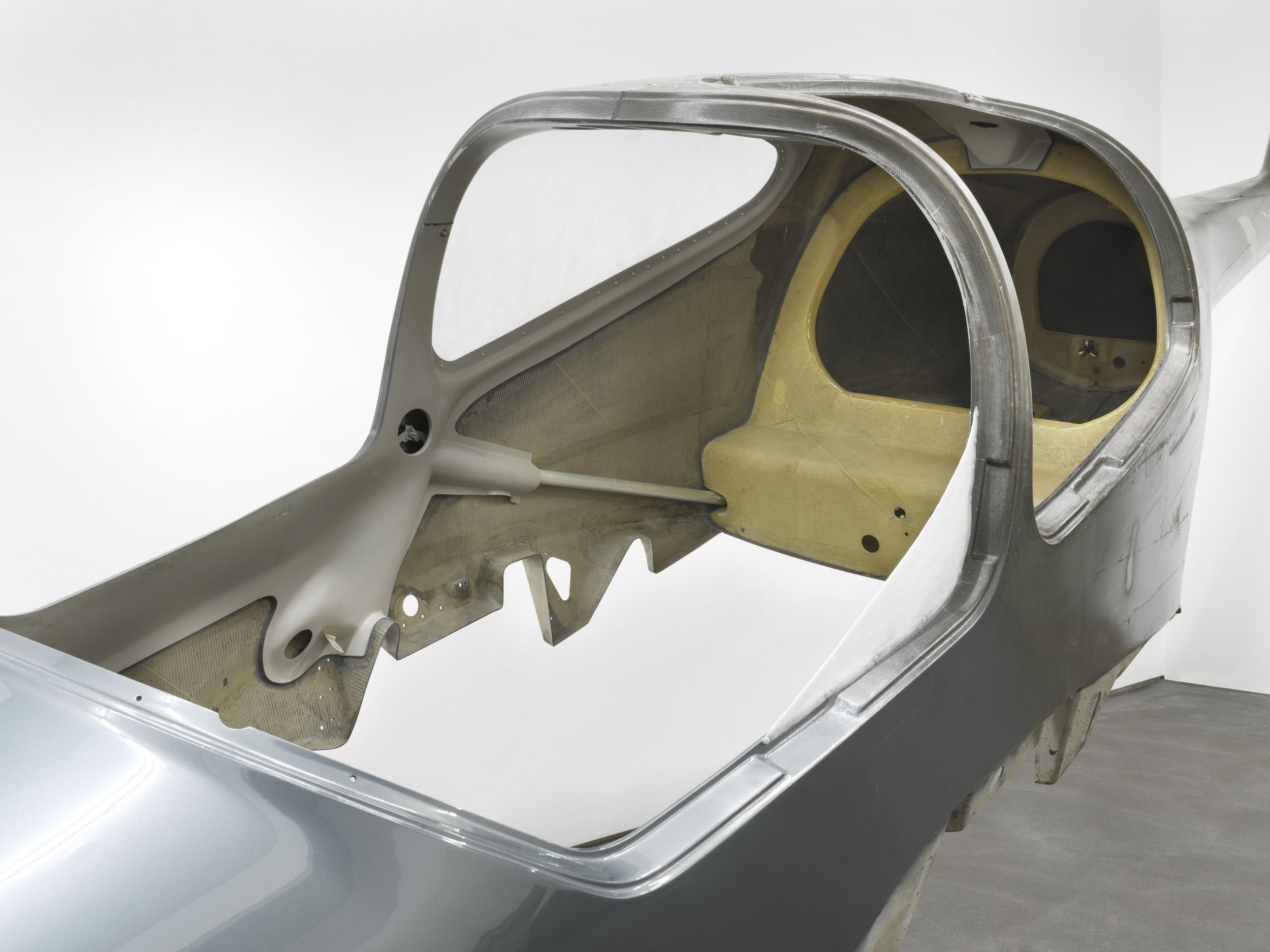 With GROUNDED, the artist presents an immersive and architectural installation that extends across the entire gallery space. In the entrance area, the wingless skeleton of a model DA42-VI aircraft is installed nose-down, suspended diagonally from the ceiling. Titled END-OF-LIFE cycle one, the piece points to the descent of the downstairs gallery space. A sprawling floor installation, END-OF-LIFE cycle two, that is composed of recycled carbon fiber and paraffin wax covers the exhibition floor; it is a fragmentary to-scale visual transfer of the decommissioned runway at Tempelhof airport, Berlin. A series of small-to-large-format paintings made of the same materials, detailing industrial design and aircraft life cycles, hang on the wall, some placed proportionally to resemble airplane windows and others matching the scale of mechanical objects within the space. These themes are reflected in the sculpture titled END-OF-LIFE cycle four, which consists of a wax landing gear and three aircraft tires from an Airbus A300 and a fourth tire in the form of an ephemeral paraffin sculpture that is slowly melting away throughout the course of the exhibition.
